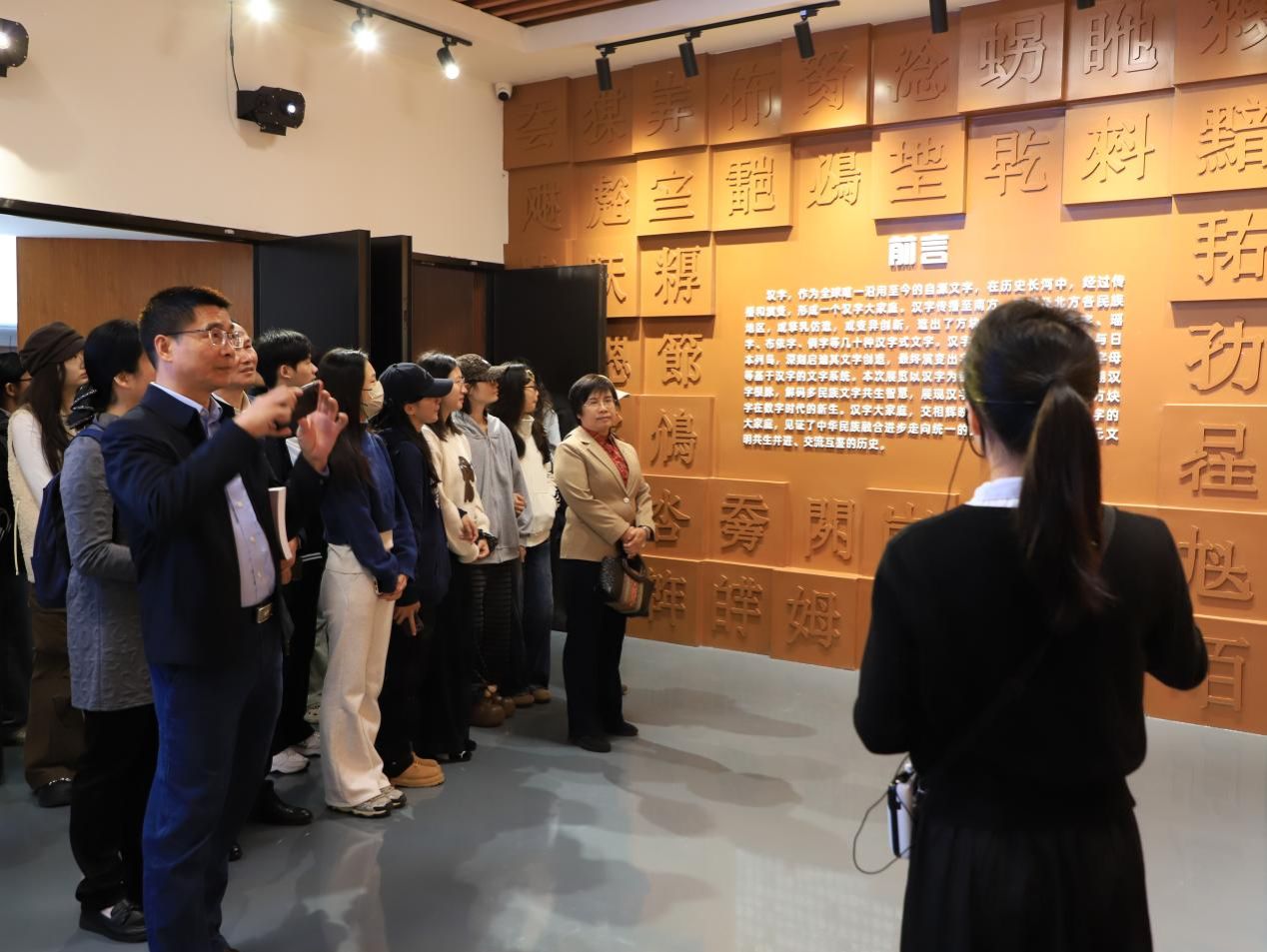 仪式结束后的首展活动上,讲解员带领嘉宾一同参观“世界方块字文化展”。本次展览以汉字为核心,共分为“根脉·汉字”“共生·汉字式文字”“衍变·国外汉字式文字”“新生·数字时代的方块字”四大单元,系统呈现汉字作为中华文明核心载体的历史演变过程及其对多元文化的深远影响。讲解员从不同地域方块字的起源与流变入手,深入阐释其文化内涵,使现场观众直观感受到方块字文化“多元共生”的独特魅力,生动诠释中华民族“多元一体”的文明格局,彰显各民族交流互鉴的伟大创造力。