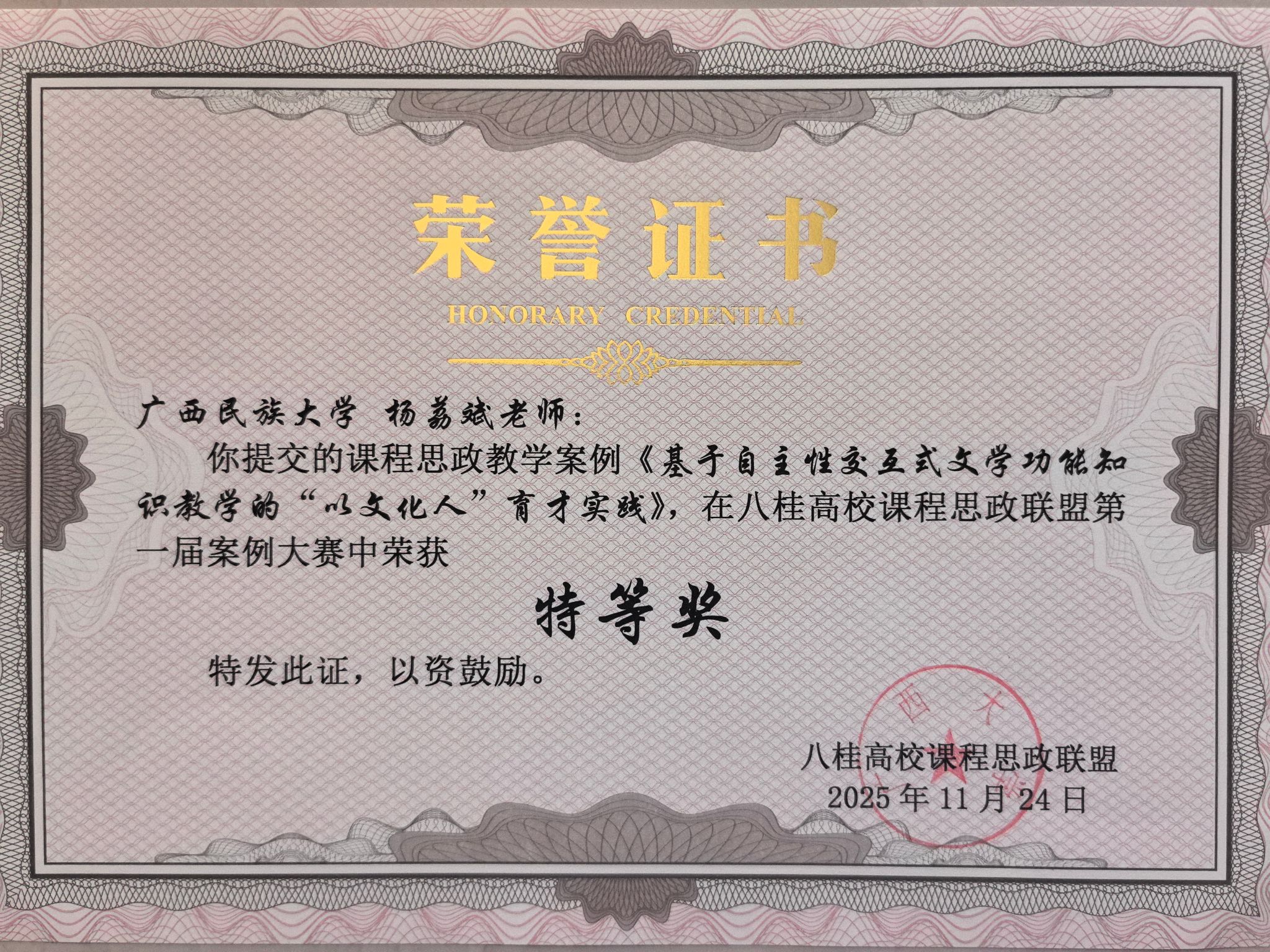 杨荔斌老师所撰写的案例《基于自主性交互式文学功能知识教学的“以文化人”育才实践》获特等奖,黄玲老师所撰写的案例《东方智慧与文明互鉴:以泰戈尔诗歌涵养人类命运共同体意识》获一等奖,陆晓芹老师撰写的《民间歌谣中的家国情怀与人民智慧》和蒙银菊老师撰写的《从“心”出发,以“情”育人——人物心理描写中的思政育人路径探索》获二等奖。我院参赛教师团队立足教学实际,紧跟学术前沿,精准挖掘思政元素与专业教学的融合点,紧密结合文学教育的内涵与特点,覆盖文学功能知识教学、东方文学经典阐释、民间文学价值挖掘等多个维度,体现思政教育与专业教学的有机融合,以鲜明的育人导向、创新的设计思路和扎实的教学能力获得评审团的认可。