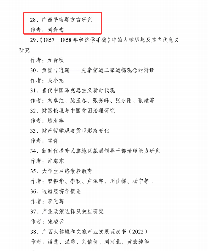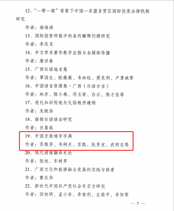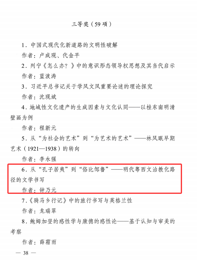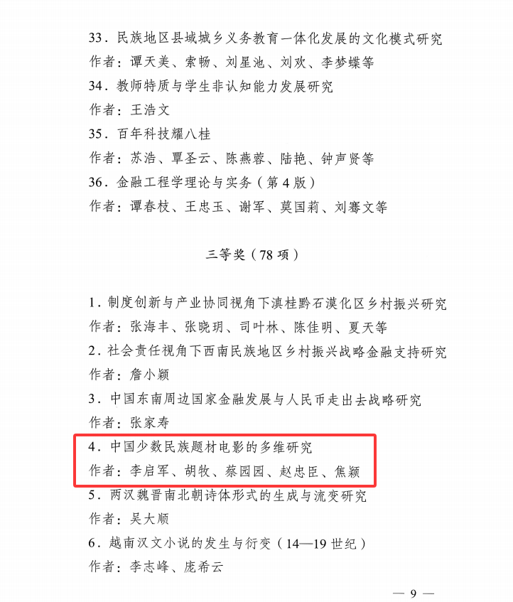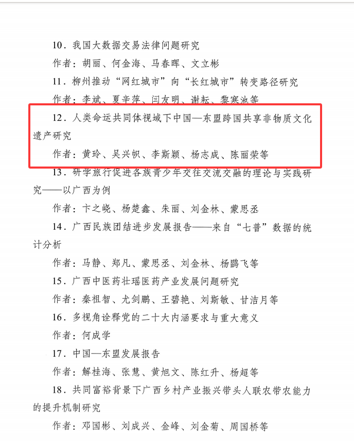 韦树关老师(排名第二)等团队《中国京族喃字字典》荣获著作类成果二等奖,黄玲老师等团队《人类命运共同体视域下中国—东盟跨国共享非物质文化遗产研究》荣获调研报告类成果二等奖。李启军老师等团队《中国少数民族题材电影的多维研究》、刘春梅老师《广西平南粤方言研究》荣获著作类成果三等奖,钟乃元老师《从“孔子居夷”到“俗比邹鲁”——明代粤西文治教化路径的文学书写》荣获论文类成果三等奖。这些研究在理论支撑、现实意义及学术价值方面取得显著成果。