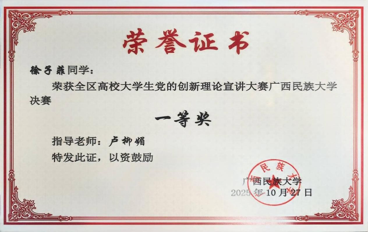 近日,由自治区党委教育工委、自治区教育厅主办的全区高校大学生党的创新理论宣讲大赛获奖名单正式公布。本次大赛组织专家对作品的主题内容、视频技术、语言表达等方面进行综合评审,共遴选出120部获奖作品,我院研究生徐子菲同学凭借作品《一张人民币里的中国答案》脱颖而出,荣获大赛一等奖。