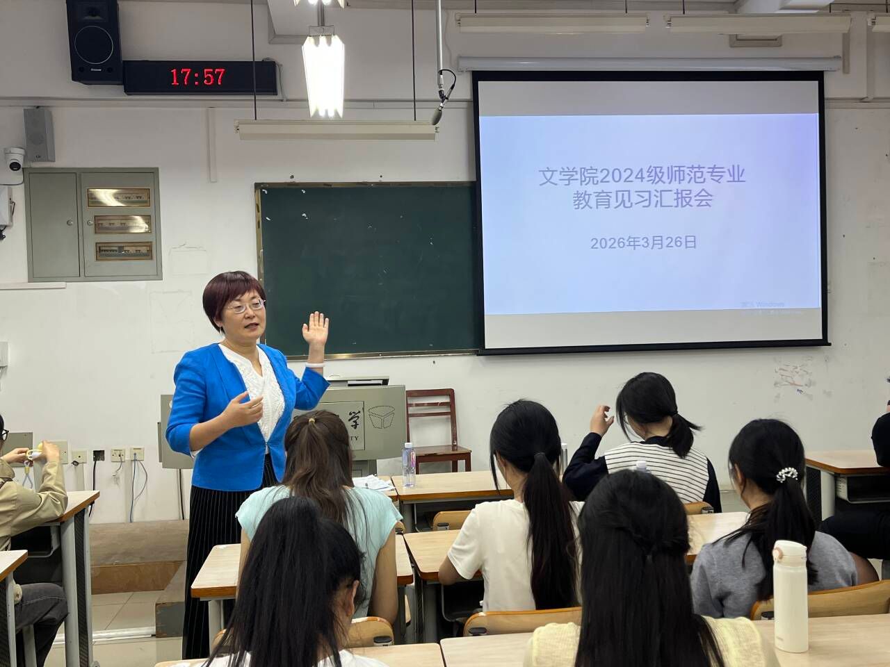 为深化师范生对基础教育的认知,搭建理论与实践转化的桥梁,3月26日,2024级汉语言文学师范教育见习总结汇报会在学友楼303室召开。语文教研室吕晓燕、赵筠老师出席本次活动,2024级汉语言文学师范1、2班全体学生参会。