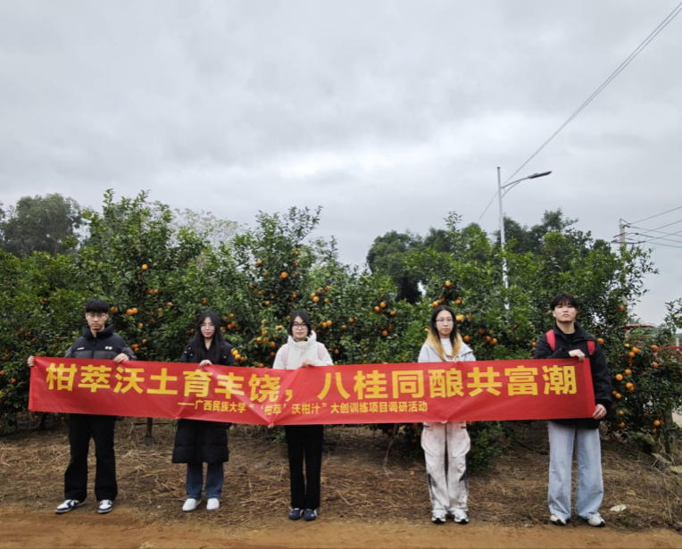 近日,广西民族大学2026年中国国际大学生创新大赛火热进行中。作为2025大学生创新训练计划国家级立项项目,“‘柑萃’沃柑汁”团队为深化项目研究、推动产业落地,团队项目组六名核心成员于2026年1月5日至1月9日,赴南宁武鸣、河池都安、柳州、桂林阳朔四地,开展了为期五天的实地调研。本次调研聚焦区域差异化发展路径与产业价值链升级,团队先后走访生产基地、加工企业、批发市场及种植园区,为切实推动项目的纵深完善和持续发展打下坚实基础。