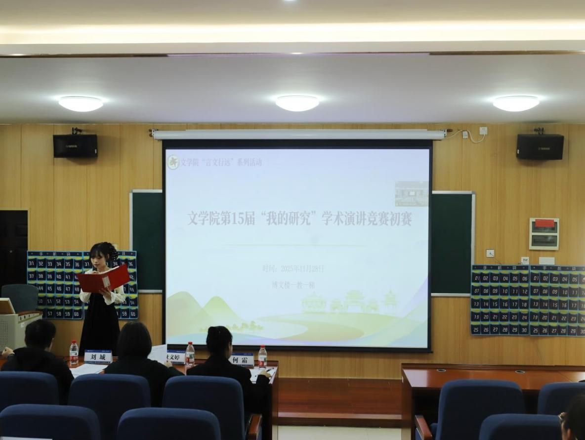 为搭建研究生学术交流平台,激发创新思维和热情,展现学术研究成果,11月28日下午,文学院在博文楼一教一梯举行第十五届“我的研究”学术演讲竞赛。本次比赛邀请耿文婷教授、何霜教授、刘城副教授担任评委,共21名硕士及博士研究生参赛,部分研究生到场观赛学习,比赛由石钰璇同学主持。