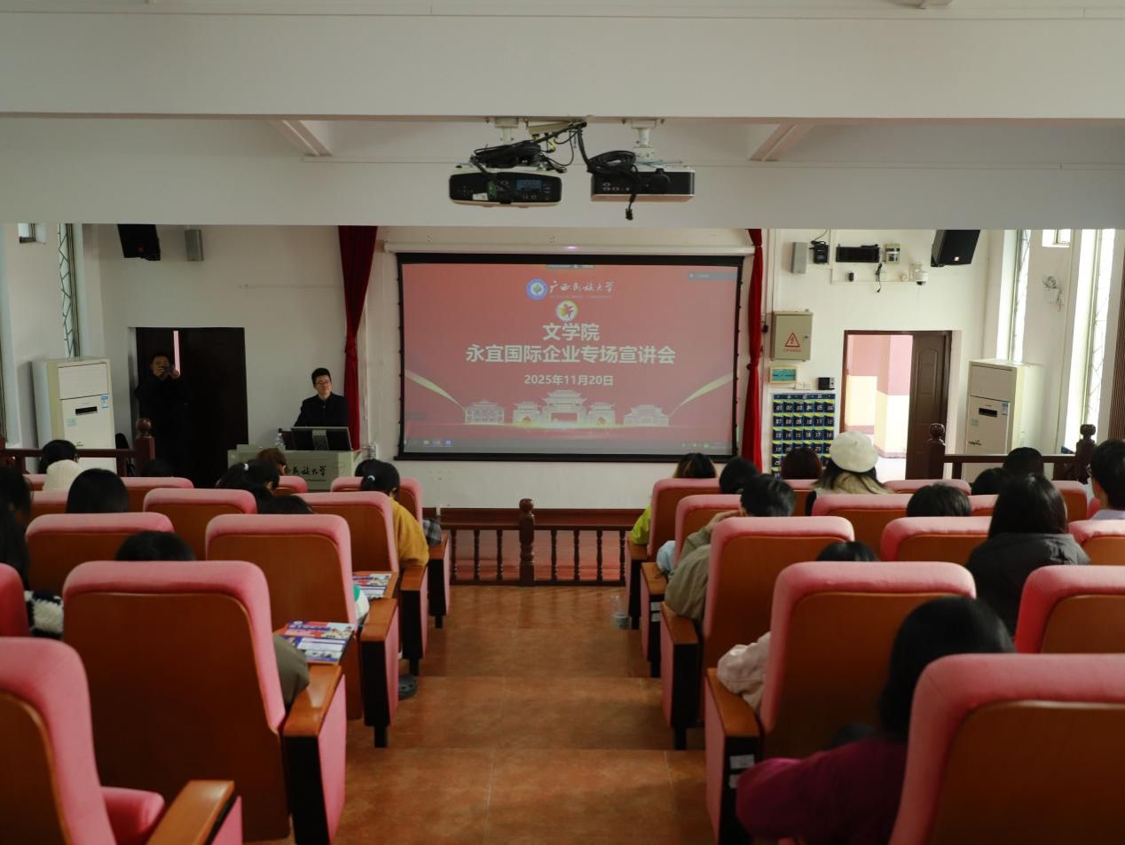 11月20日,文学院在博学楼三教三梯会议室召开永宜国际企业专场宣讲会,组织汉语国际教育印尼语方向学生参加。本次宣讲会聚焦“一带一路”倡议背景下中资企业的海外服务需求,面向语言类、国际教育等相关专业学生,介绍企业业务布局、岗位需求及福利政策,搭建起校企人才对接与合作的沟通平台。