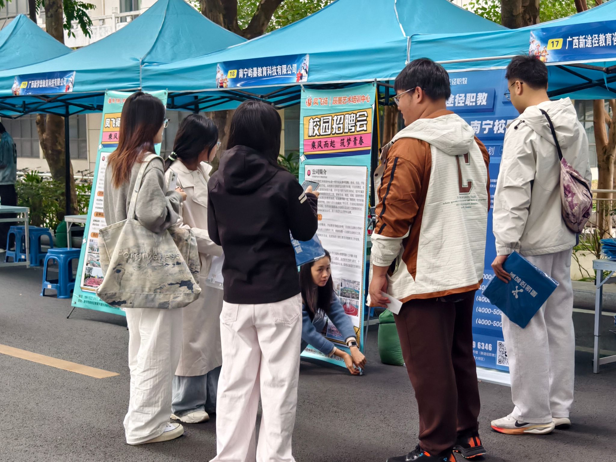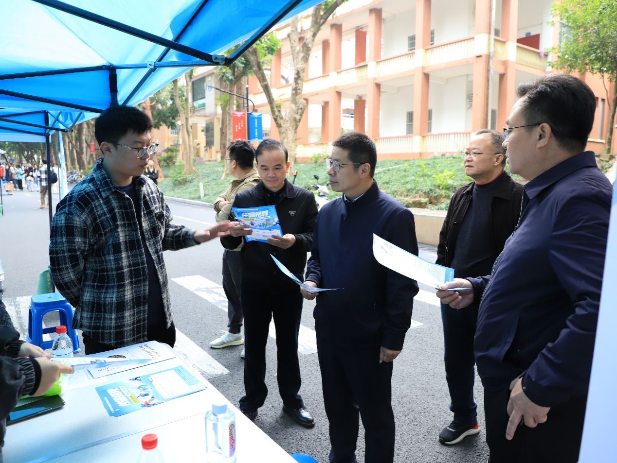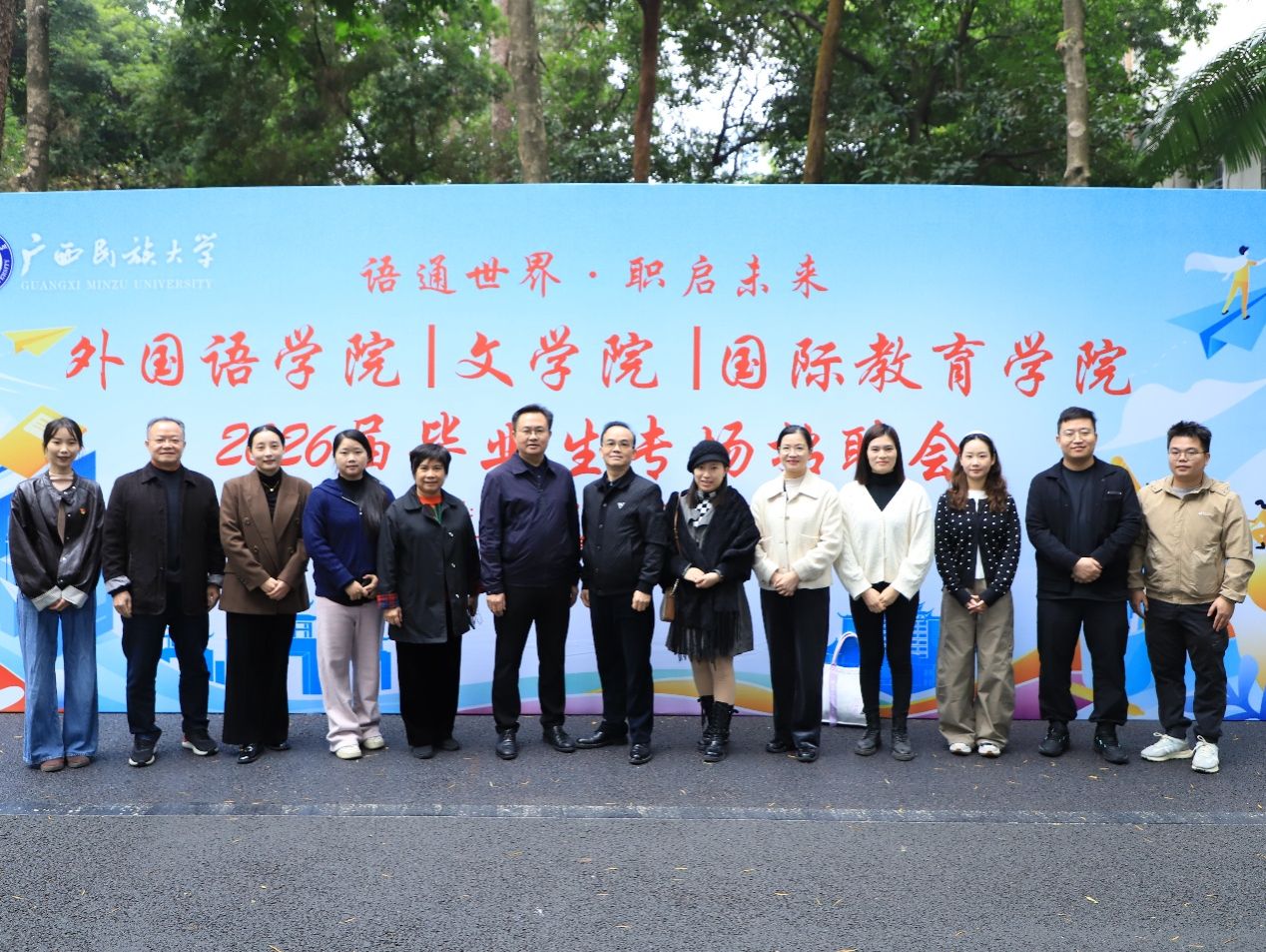 12月5日,2026届毕业生专场招聘会在广西民族大学相思湖校区校友南路举办,本次招聘会由文学院、外国语学院、国际教育学院联合主办。学校党委副书记邓国彬亲临现场指导工作,文学院党委书记唐艳军、院长陆晓芹、党委副书记吴先源与教师代表共同走访招聘展位。