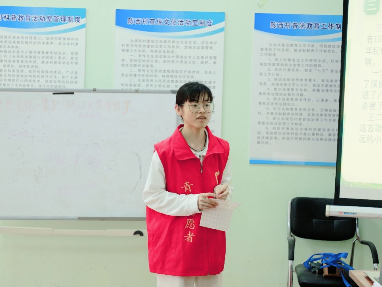 3月21日下午,文学院志愿者赴上尧街道陈西村新时代文明实践站开展“清风寄思念,明月慰忠魂”爱心课堂活动。2023级汉语言文学师范3班梁悦担任主讲人。