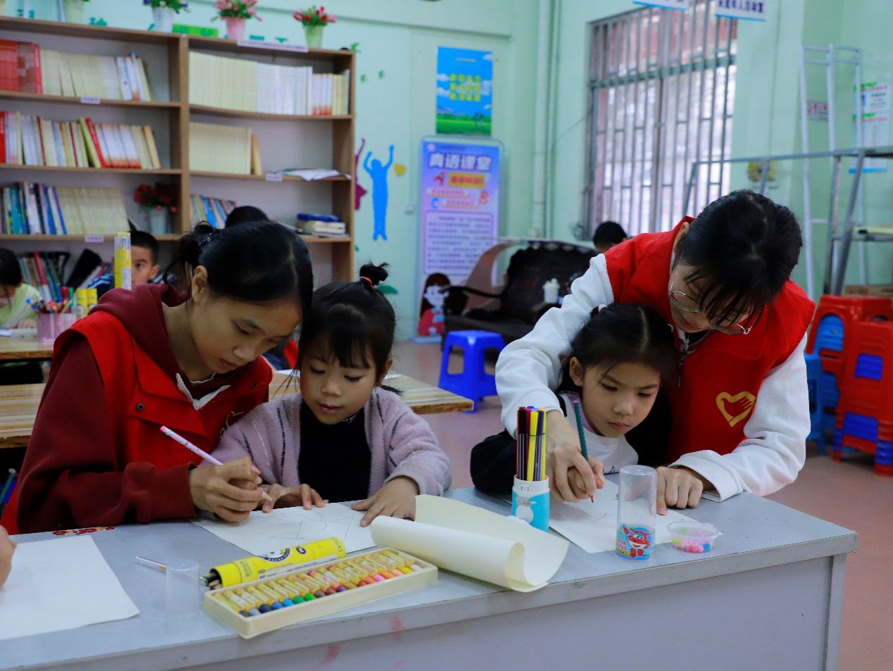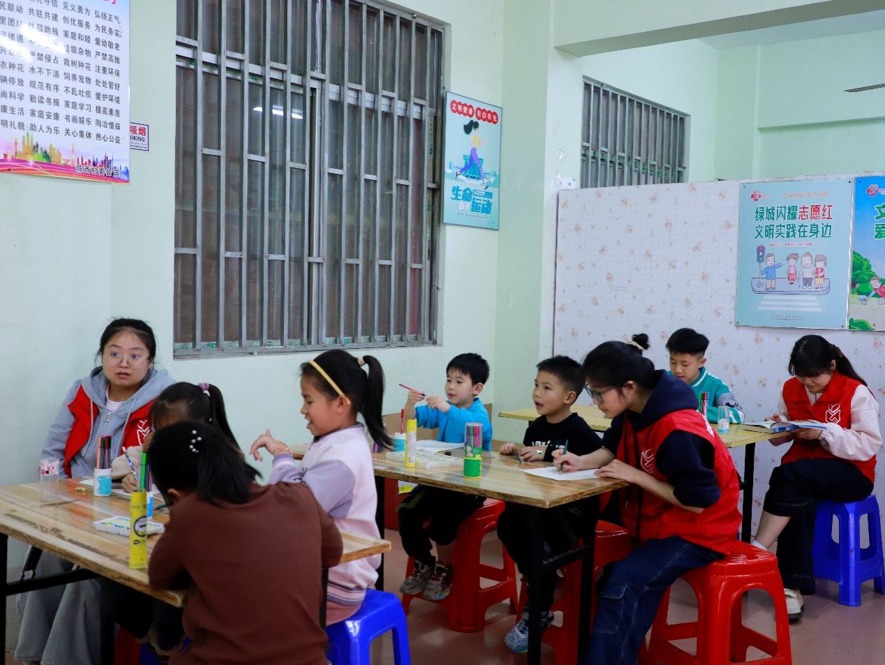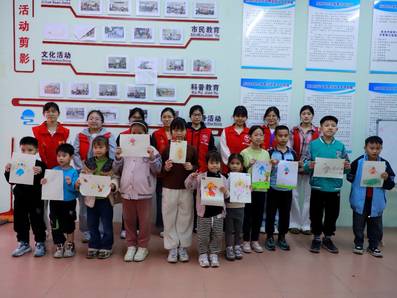在绘画环节,志愿者们结合清明节放风筝等传统习俗,指导协助小朋友们绘制风筝纪念先辈。完成后,小朋友们展示成果并与志愿者们合影留念。
