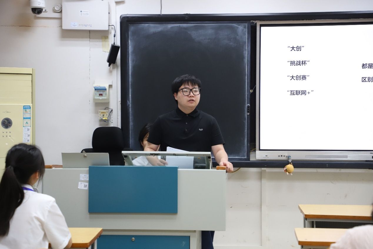 创新创业部其他成员蔡知恩、覃慧平、李桥怡三位同学进行补充讲解。蔡知恩围绕创新创业训练项目的定义、类型、实施方式及成果影响展开介绍。覃慧平梳理“挑战杯”系列竞赛的相关内容。李桥怡对中国国际大学生创新大赛、“挑战杯”及大学生创新创业训练计划三者的区别进行说明。