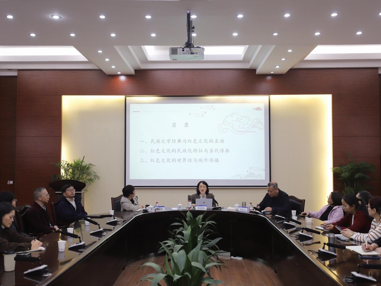 12月22日下午,文学院在国际合作与交流处大会议室举行“民族文学经典中的红色文化传承与传播”学术讲座。本次讲座由广西师范大学黄晓娟教授主讲,中央民族大学钟进文教授与谈,文学院陆晓芹教授主持,部分师生到场参加。